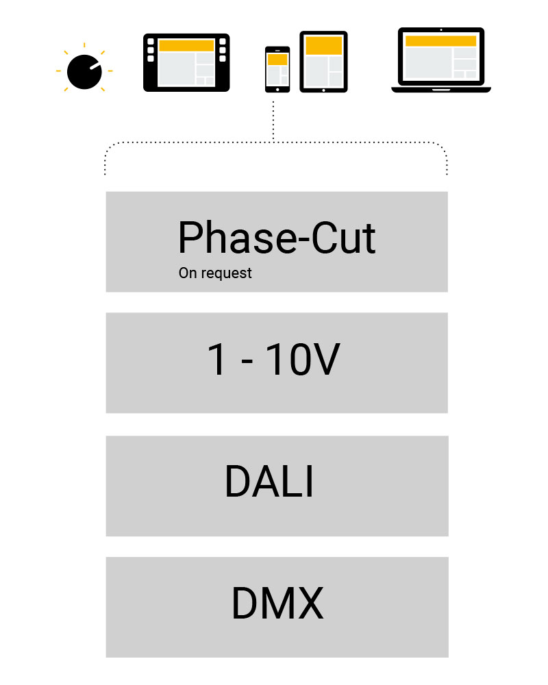 If equipped with Phase-Cut, 1-10V, DALI or DMX fittings, by controlling the light with your smartphone, tablet or pc, through bluetooth or wireless, you could create in an immediate and user-friendly way the desired scenarios.