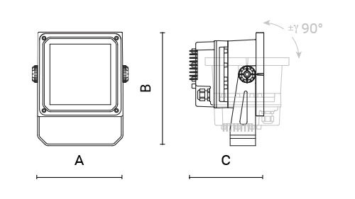 Floodlight for indoor and outdoor lighting of large areas, designed to combine high lighting performance with versatility of use, to customize lighting according to the needs of the project. The LED temperature control device guarantees maximum energy efficiency and maximizes source lifetime.