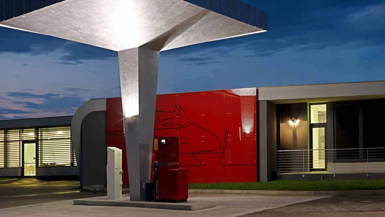 By adding lighting to the design, the architect who planned this service station intended to unify the basic concept underlying the artwork.